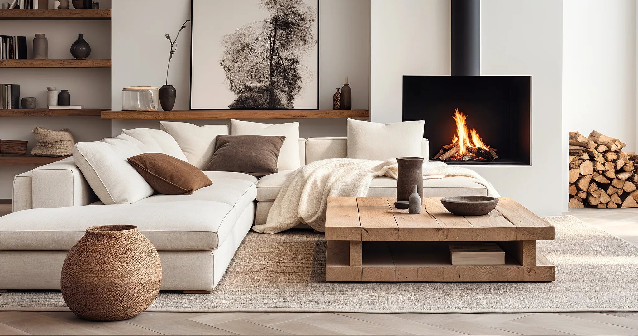 Dieses Design bringt die Ruhe und Gelassenheit der Natur in ihren Wohnbereich und erzeugt eine Fusion zwischen Innen und Außen. Das Farbschema ist unaufdringlich, sanftes Weiß, warme Grautöne und erdende Brauntöne.